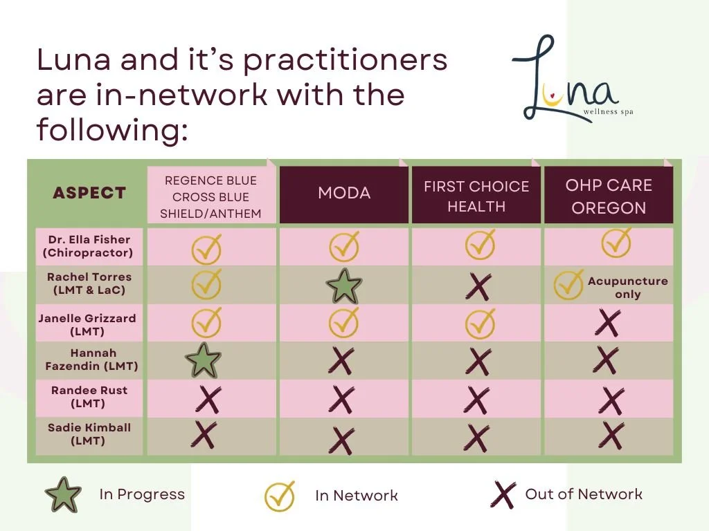 At Luna Wellness, we work with a few select insurance networks, and coverage can vary depending on your provider, plan, and the practitioner you see. Some of our practitioners are in-network with certain plans, while others are considered out-of-network.